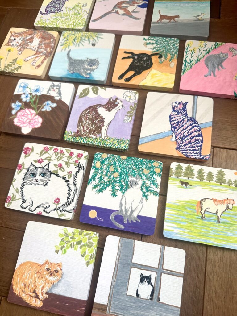 ねこのペイントシリーズ / 2025 各H9×W9×0.8cm / acrylic on wood board